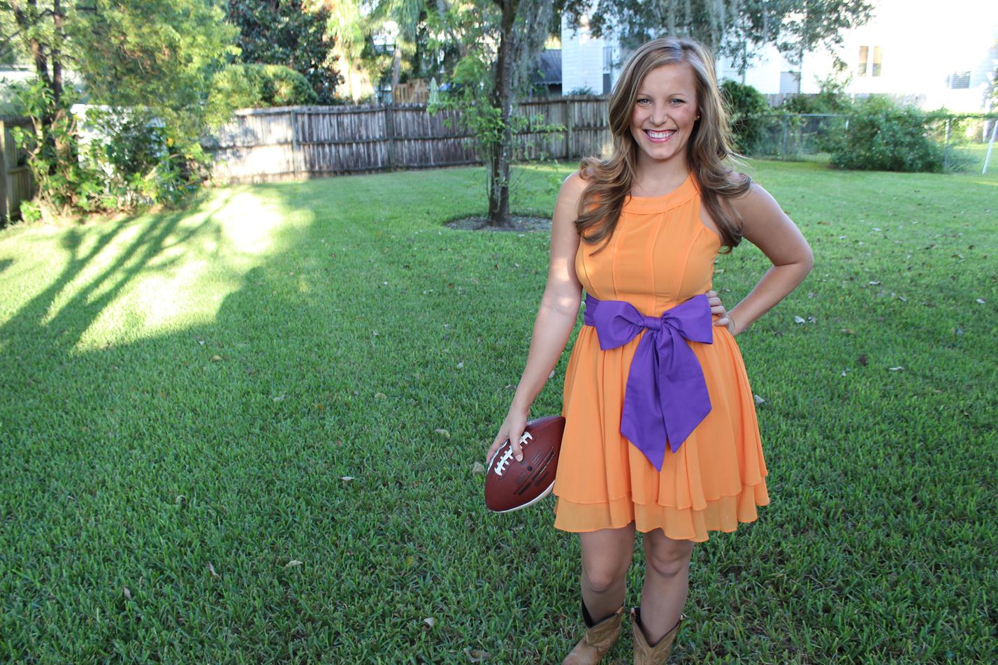 Ok, I thought, I'll make my own belt. Bad.Idea. Fast forward through a trip to Hobby Lobby and a glue gun, belt crafting experiment gone wrong, and I am still stuck with a shapeless, yet Clemson gameday perfect dress I want to wear. Sure, I could get it tailored -- but that's time and money I just don't have.